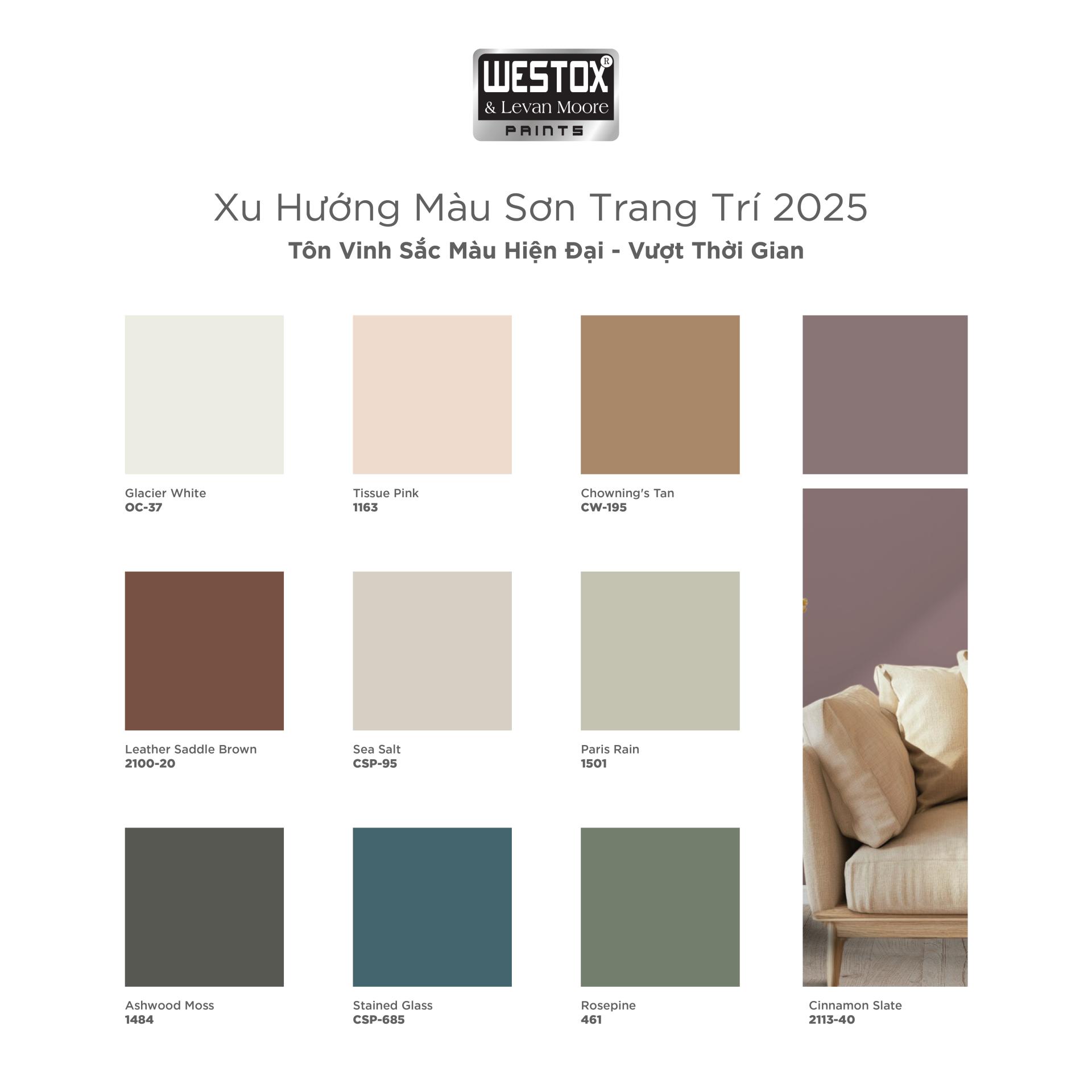 Các màu được ưa chuộng trong năm 2025 là: trắng, xám, vàng ấm, xanh lá, hồng, nâu đất, đen, xanh dương, cam đất, tímSIRADaily Sonepoxy.